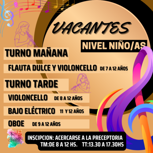Atención!!! Hay lugares para nivel niños/as que tengan entre 8 y 10 años para los siguientes instrumentos OBOE- FLAUTA DULCE- FLAUTA TRAVERSA Y CELLO.Si te interesa acércate a la preceptoría de 14 a 17:30.Les esperamos - Convocatoria abierta a 50 años del golpe cívico-militar.