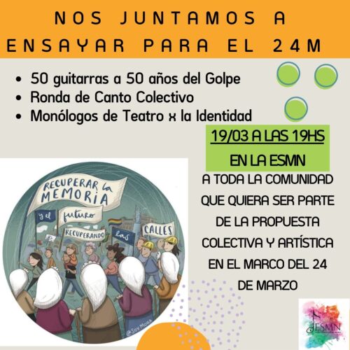 - Convocatoria abierta a 50 años del golpe cívico-militar.Acompañaremos las actividades del día de la Memoria por la Verdad y la Justicia en Neuquén aportando arte en colectivo.El 24 de marzo de 16 a 18hs en jornada artística, nos sumamos a la construcción colectiva y cotidiana de la memoria en clave presente.Organizado por docentes y estudiantes de la Escuela Superior de Música de … [+]